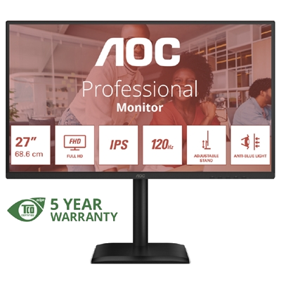 MONITOR AOC LCD IPS 120HZ 27″ WIDE FRAMELESS 27E4U 4MS MM FHD 1500:1 BLACK REG.ALT. VGA HDMI DP 4XUSB VESA GAR. 5ANNI FINO:31/03